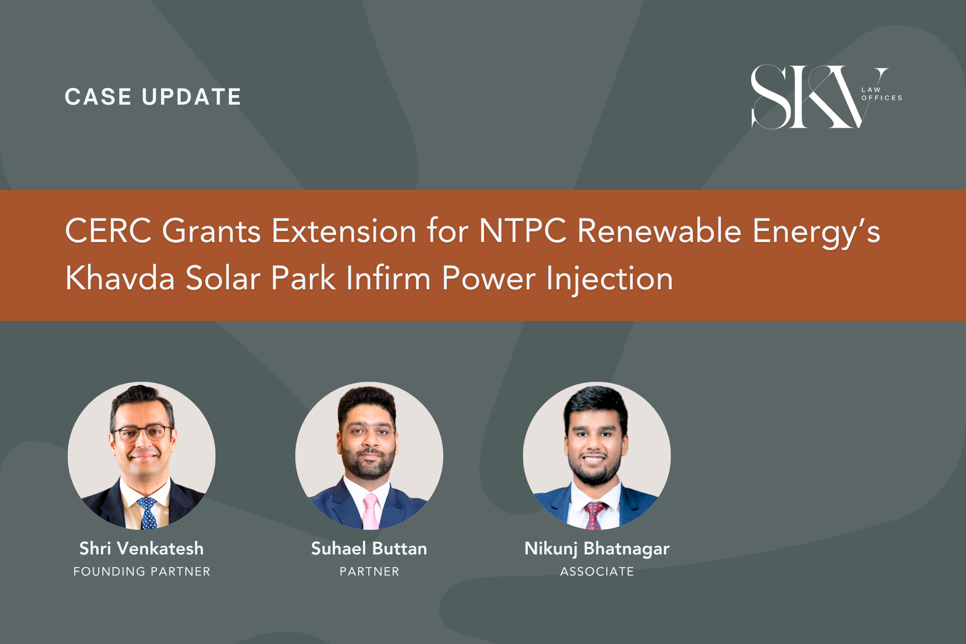 NTPC Renewable Energy Limited  was represented before the CERC by Shri Venkatesh, Founding Partner; Suhael Buttan, Partner; and Nikunj Bhatnagar, Associate of the SKV Law Offices team.